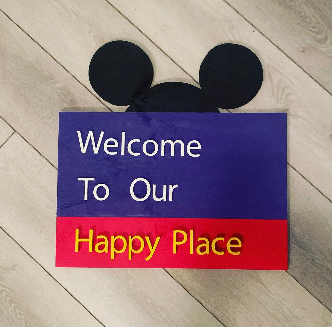 20” 3D wood Disney Street Sign Inspired “Welcome To Out Happy Place” sign cut from 1/2 and 1 inch wood. Each piece is hand cut, sanded, painted, stained, and mounted.